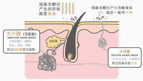 腋臭表现为双侧腋下散发出难闻气味,多在青春期发病,与遗传有一定的关系。腋臭的确切发病机制尚不明确,一般认为异味的产生与腋窝部的顶泌汗腺密切相关,顶泌汗腺分泌的物质经皮肤表面的细菌作用,分解为多种不饱和脂肪酸,从而产生特殊的气味,俗称“狐臭”。