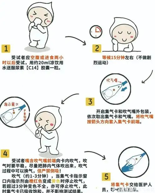 1.13C-或14C-尿素呼气试验法:让患者服用诊断药,对比服药前后的呼气进行检测。