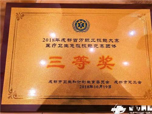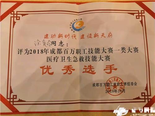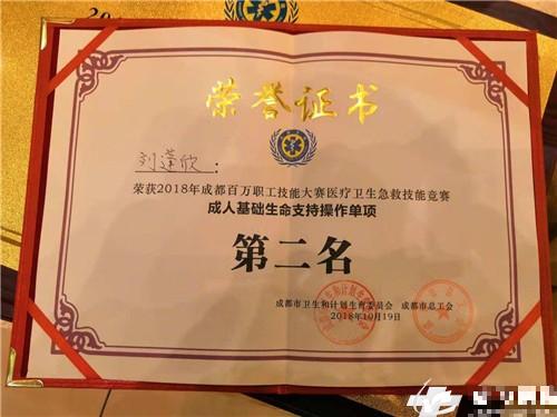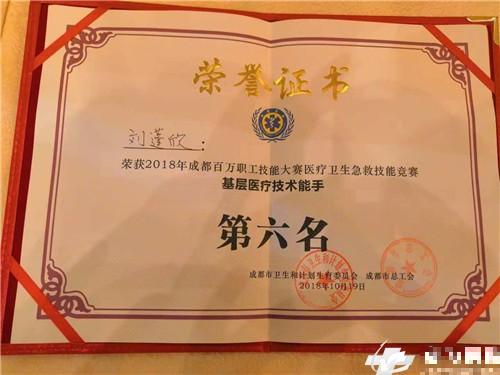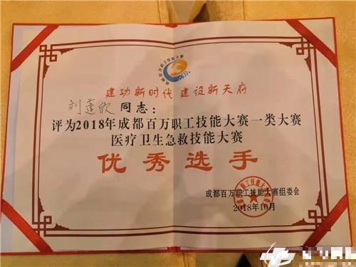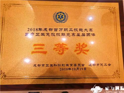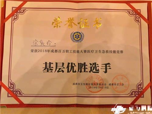 获得个人奖5项:医生刘蓬欣获得“成都市百万职工技能大赛成人基础生命支持单项操作第二名”、“基层医疗技术能手第六名”、“成都市百万职工技能大赛一类大赛医疗卫生急救技能大赛优秀选手”;护士涂爱玲获得“基层优胜选手”、“成都市百万职工技能大赛一类大赛医疗卫生急救技能大赛优秀选手”荣誉奖。